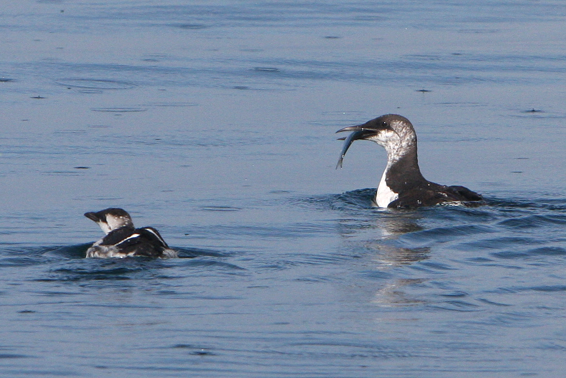 During a point count yesterday we observed 1655 common murres within approximately 1 kilometre of our research boat. Over the course of the day we saw several hundred more as well as numerous other bird, mammal and fish species. One thing that most of these species we observed have in common is that they feed on herring and many of them actually rely on common murres and other alcids to corral these fish into tight schools (bait balls) and push them to the surface so that they can be easily fed on. It is thought by some that the reduced wing area of the common murres during the moult may actually reduce drag and increase the maneuverability of these birds while under water catching and corralling everyone’s favourite prey.