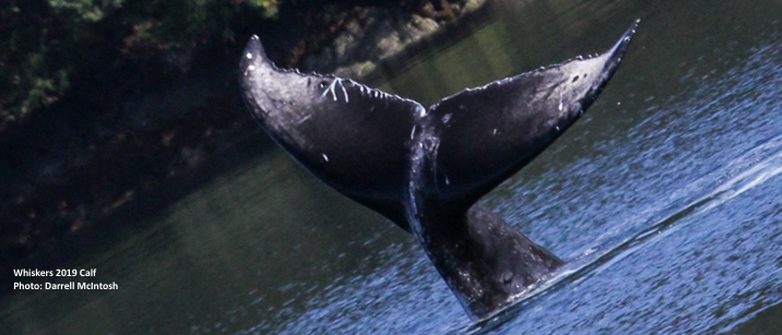 “Whiskers” is the nickname for Humpback BCZ0200 (photo below). Catalogue designations like “BCZ0200” are difficult to remember so we nickname the Humpbacks for distinctive features. See what looks like a cat face on Whiskers’ tail?