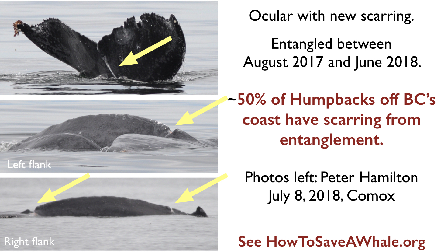 They are not exceptional cases. Our research, done in collaboration with DFO, shows that ~1 in 2 Humpback Whales off BC’s coast have scarring from entanglement. This data provides an indication of how serious the risk of entanglement is but does not reveal how many Humpbacks die after becoming entangled.