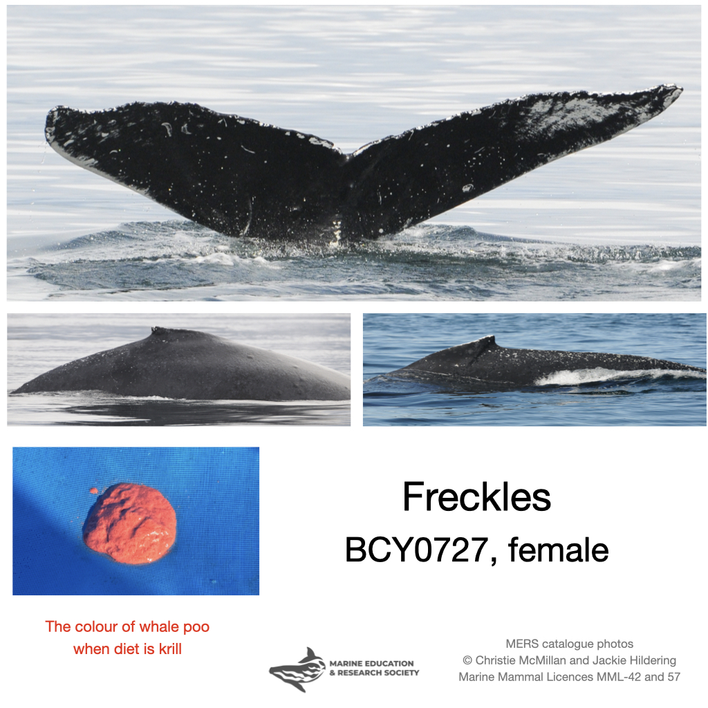 Freckles was tail-lobbing which makes it easier to see that she had been defecating. The colour suggests she’s been eating both krill and small schooling fish (most likely herring). When a Humpback’s diet is fish, the colour is grey and when the diet is krill, the colour is intense orange (see photo at the bottom of this blog).