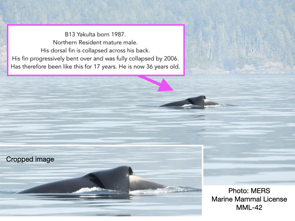 Thankfully there’s really good information in a blog from the BC Cetaceans Sightings Network from 2014 entitled “The case of the flopped-over fin” by our friend and co-founder Caitlin Birdsall. Caitlin is now our Director of Development.