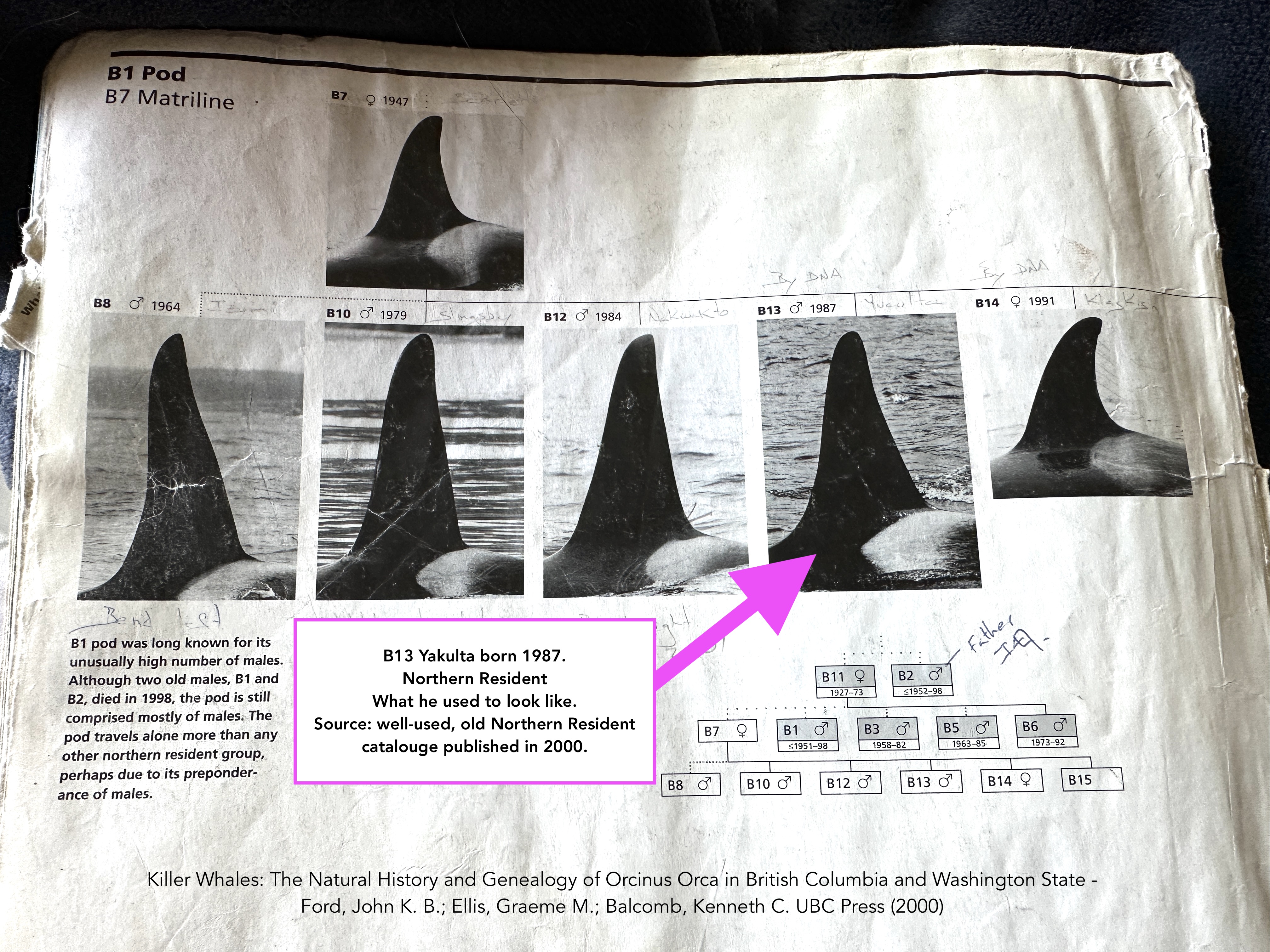 We’ve received questions about B13 (Yakulta), an Orca whose fin is fully flopped over. His fin has been like this for 17 years. It’s extremely rare for this to happen in Orca in the wild. Read on.