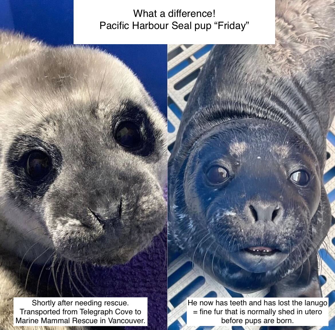 On June 17th, it was determined by Marine Mammal Rescue that this neonate seal pup was indeed in trouble. We collected him from Telegraph Cove and he was flown to the rescue centre in Vancouver.