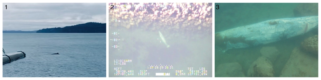 To my knowledge there are no confirmed records of minke whales off northeastern Vancouver Island between December and February. However, this changed on February 3rd 2022 when Callyn Holder and Scott Turton saw and photographed a small minke whale surfacing near the Sointula ferry terminal (Figure 1). Four days later (February 7th) the Transport Canada pollution surveillance plane filmed a whale-like shape motionless in shallow water inside the Sointula breakwater in Rough Bay. It was filmed from the air again on February 23rd (Figure 2) and I was able to verify with an underwater camera that it was a minke whale on February 27th. The skin had deteriorated along most of its body and the tips of both lower mandibles were exposed, but otherwise, it was fully intact. However, it also had a bloody gash about 60 cm long running perpendicular across the top of the head (Figure 3).