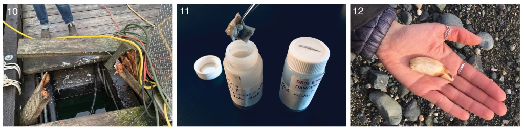 The next day (March 3rd) I went back to Sointula to meet with Jim McDougall and Bridgette (Bridie) McDonald. Interestingly, on January 21st 2022, Bridie had discovered several broken planks on L finger of the dock inside the Sointula harbour. They had been broken from underneath and some of them as well as parts of the frame of the dock had layers of smooth dark grey and light grey skin on them (Figure 10). Jim pried up one replacement plank and I was able to find some leftover bits of skin to put in a sample vial with ethanol. I sent this sample alongside another taken from the carcass (Figure 11) for DNA analysis to determine if it was indeed this minke that had busted up the dock. Considering the timing, location, gash across the head and broken skull tip it seems rather likely, but this kind of event is so unusual that we will leave the conclusion to the geneticists. In fact, the most similar incident I’ve dug up so far came from Graeme Ellis who years ago heard of a report of a whale busting up through the planks of a wooden sailboat. It seemed like the kind of bad excuse a careless navigator might make after hitting a rock, but they had whale baleen broken off in the boat to prove it.
