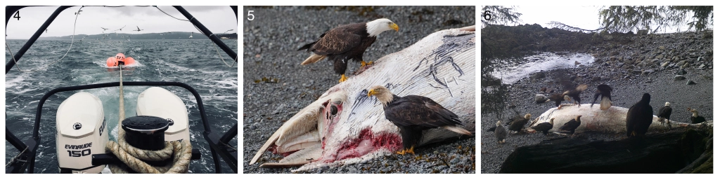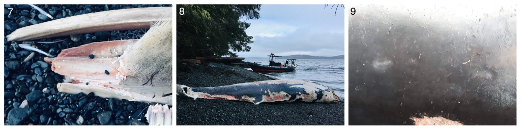 Three days later (March 2nd), Jackie Hildering dove on the carcass and tied a rope around the peduncle. I secured six scotchman to the line to act as an inverted catenary and then towed the carcass (Figure 4) to a remote beach nearby for sampling, decomposition and deboning. At low tide later in the day, I returned to find several bald eagles and ravens (Figures 5 & 6) picking at it. They had focused their efforts mostly around the head but, had also been ripping strips of flesh off all other accessible areas. Nevertheless, Elysanne Durand, Celine van Weelden and I could see that there was pre-existing damage to the tip of the skull (Figure 7) and that the dorsal fin had already lost much of its natural shape ruling out any hope for a match to any individual in the coastwide photo-identification database (Figure 8). Two well-healed cookie-cutter shark scars (Figure 9) were visible on the left posterior flank of the whale and its overall length was measured at 5.95 metres indicating that it was a juvenile and therefore not any of the six seasonal residents known to northeast Vancouver Island who are all adults and likely in the 7-9 metre range.
