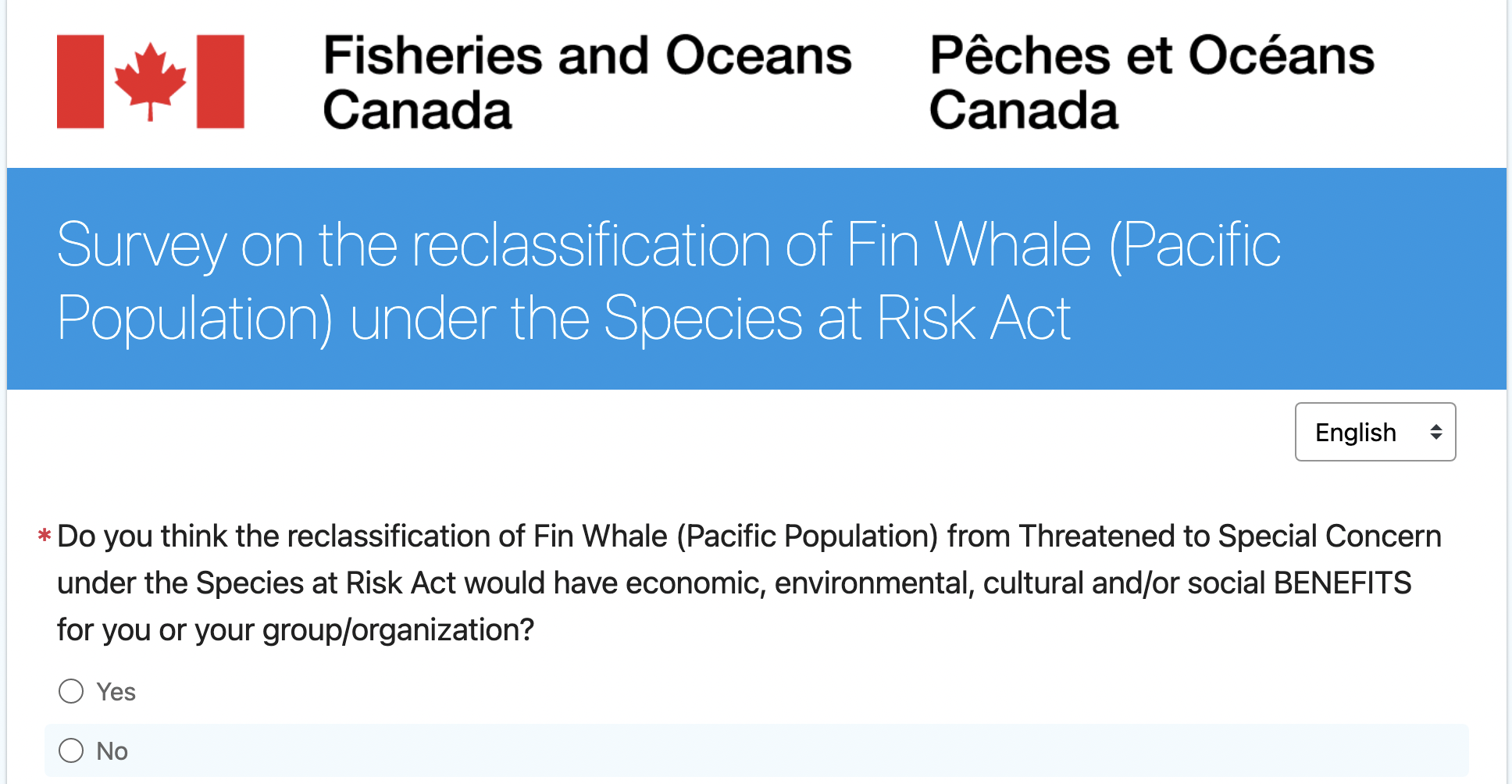 The latest assessment report by the Committee on the Status of Endangered Wildlife in Canada (COSEWIC) makes recommendations that would reduce the protection of Fin Whales in British Columbian waters. The Government of Canada is considering this recommendation through a public consultation process, happening now.